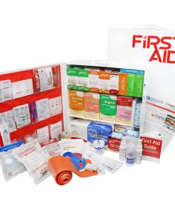 If you are looking for both OSHA and ANSI Compliance, we took our best value in a Class B ANSI standard and OSHA required content, added a pocket liner for your own customized content in the door space and ended up with this great medium, 3-shelf, 1,382-piece industrial first aid station, designed for medium sized businesses, offices and work sites with a broader range and quantity of supplies to deal with injuries more complex or high-risk environments such as warehouses, shops, and industrial environments. This First Aid Cabinet can act as a satellite first aid cabinet for buildings, wings or departments or serve as a stand-alone fully-stocked medical box for up to 100 people. The swing-out door and easy-to-carry handle add extra convenience. Exceeds OSHA and ANSI 2015 Standard fill requirements with the additional first aid items needed for healthy and safe operations. The wide variety of products are designed to handle first aid emergencies from burns, major bleeding and eye injuries to discomfort from minor cuts and abrasions – as well as the addition of the ANSI required tourniquet and splint. Cabinet manufactured in America, and Kit assembled in USA of domestic and imported first aid content items meeting strict FDA, OSHA, and ANSI guidelines.