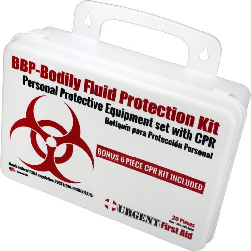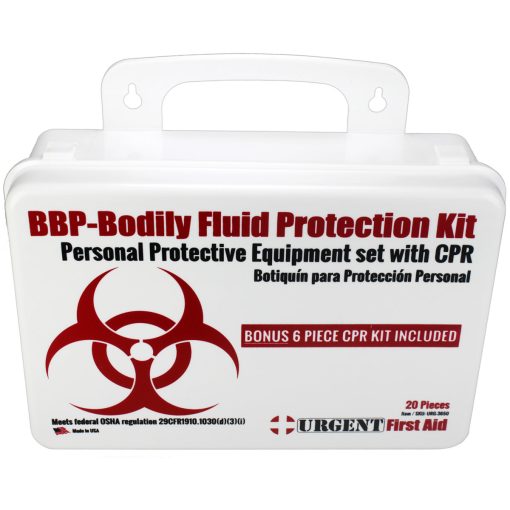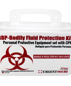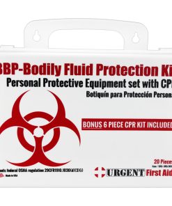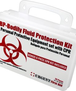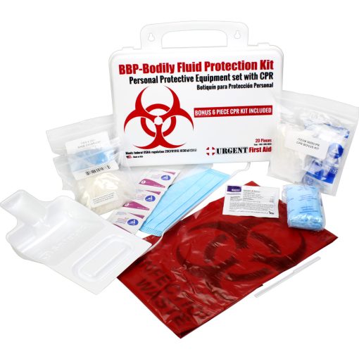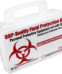This Urgent First Aid™ 24-piece, personal protection kit is designed to guard persons attending to the injured or ill against contact with infections carried in blood and body fluids. Greatly reduce infectious risk factors your workers face every day from improper body-fluid spill clean-up. (Many companies specifically require this kind of protection.)