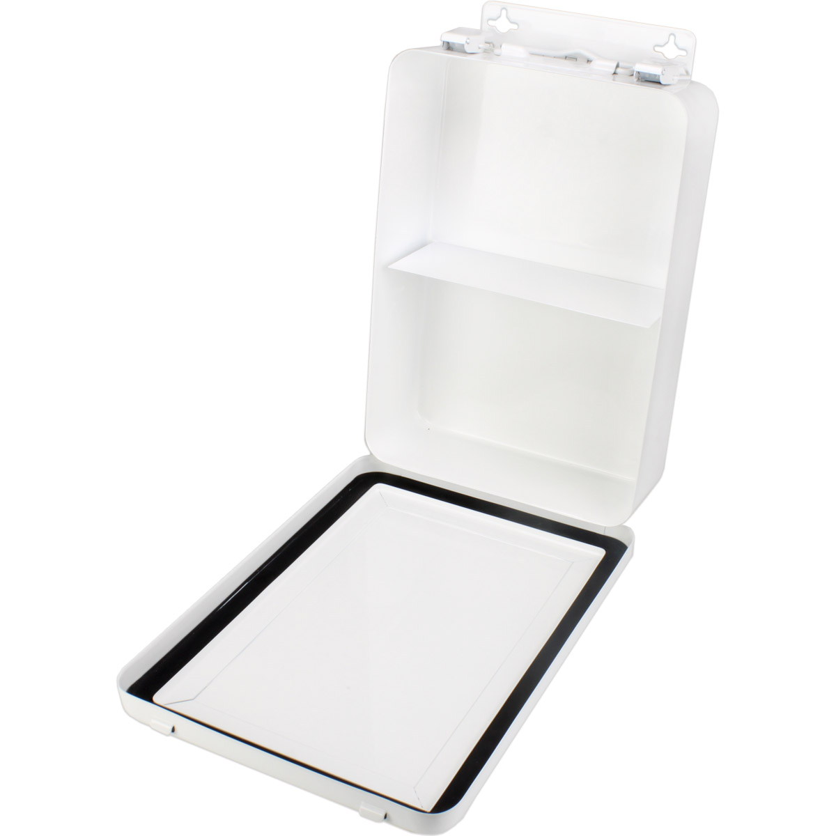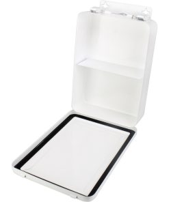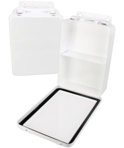 This vertically configured empty metal first aid case holds up to 16-units of products and features a hanger and gasket.