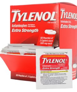 Extra-strength Tylenol – 50 2-Packs – 100 Tablets Per Dispenser BoxWhen you need something stronger, extra-strength Tylenol®, provides effective relief for minor aches and pains due to headache, muscular aches, backache, arthritis, the common cold, toothache, menstrual cramps, temporarily reduces fever. Active ingredient: Acetaminophen 500 mg.