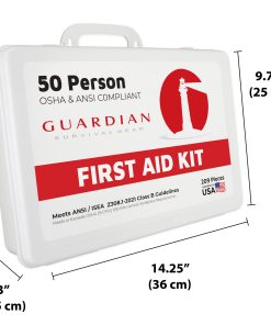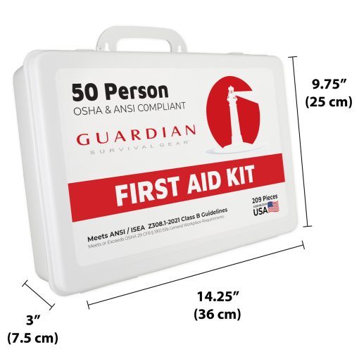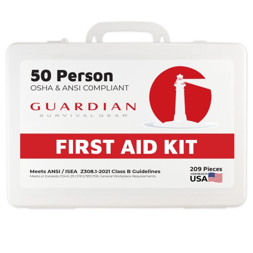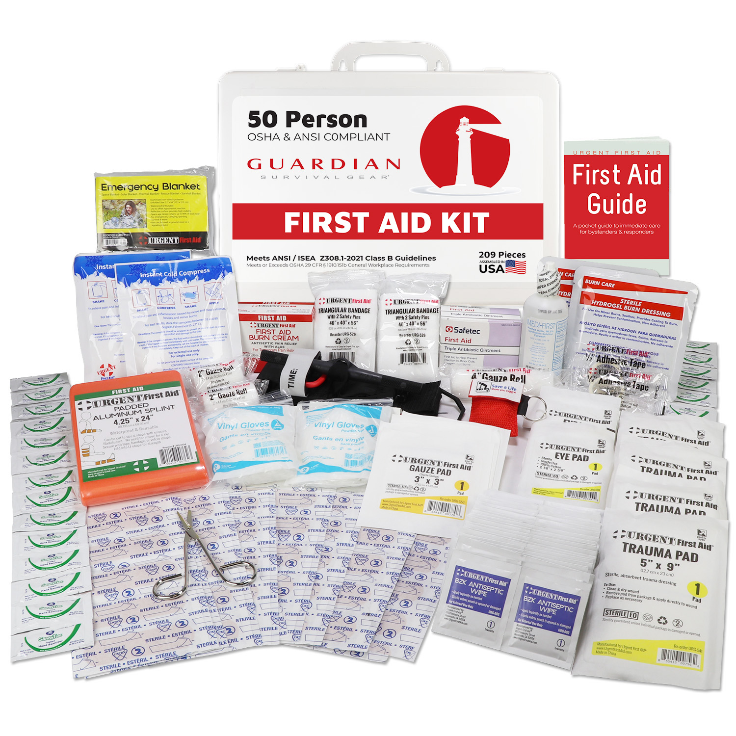 Guardian Survival Gear First Aid Kit, 209 Pieces, ANSI Class B, 25 to 50 Person in a lightweight, yet durable gasketed plastic case that is both portable and wall mountable. Meets ANSI case types I, II, III.