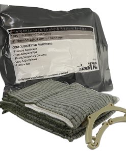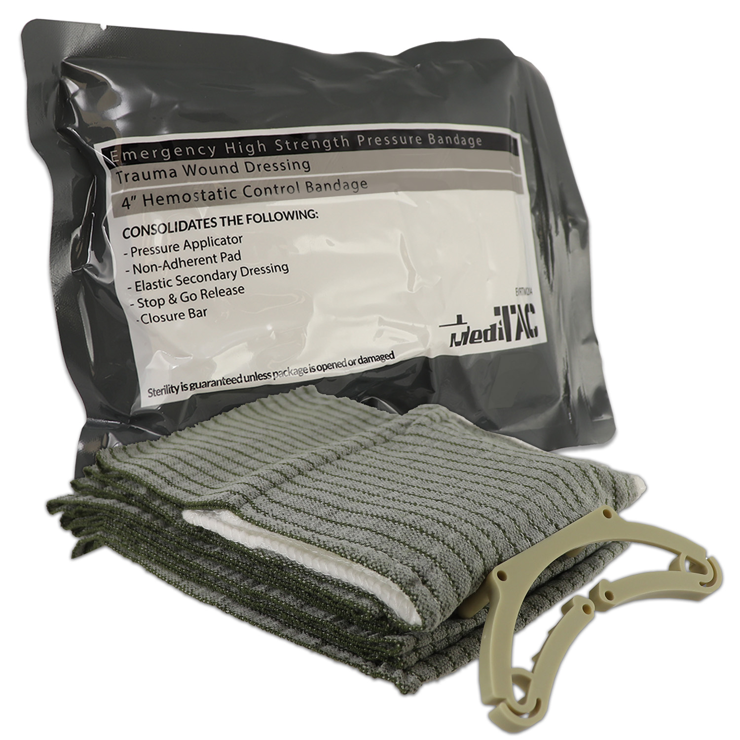 Performance Systems presents an innovative, combat proven first-aid device for the staunching of blood flow from traumatic hemorrhage wounds in pre-hospital emergency situations. This 4″ wide, all-in-one device consolidates multiple first-aid devices such as a primary dressing, pressure applicator, secondary dressing, and a foolproof closure apparatus to secure the bandage in place. This internationally patented and FDA approved bandage is the ideal solution for emergency treatment when every second counts.The Emergency Bandage is designed for quick and easy application by professional and non-professional caregivers to provide effective, multi-functional treatment.The Emergency Bandage’s sterile, non-adherent pad applies pressure to any site, can be easily wrapped and secured, and has an additional application, similar to a tourniquet, to further constrict blood-flow.The product is so easy to use that even an injured person can self-apply the bandage with one hand.