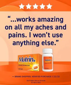 Motrin IB – 50 2-Packs – 100 Per BoxMotrin brand Ibuprophen, offers temporary relief of minor aches and pains associated with headache, muscle aches, toothache, backache and the aches and pains associated with arthritis, menstrual cramps and the common cold. Also effective for reducing fever. Active ingredient: Ibuprofen, 200 mg.