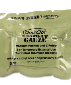 QuikClot Combat Gauze is a 3-inch x 4-yard strip of z-folded soft, white, nonwoven, hydrophilic gauze impregnated with kaolin, an inorganic mineral that is both safe and effective in accelerating the body’s natural clotting cascade without any exothermic reactions or use of animal or human proteins.